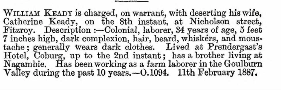 William and Kate seem to have had a rocky marriage. In 1887, William is charged with deserting his wife. The notice in the Police Gazette of February 16, 1887 says that William has been working in the Goulburn Valley for the last 10 years. The notice gives a good description of William.