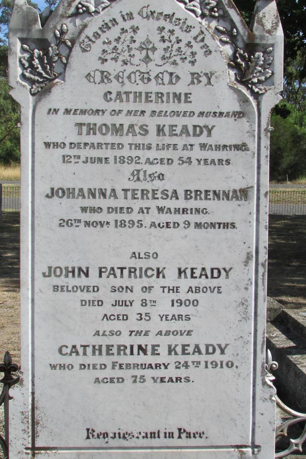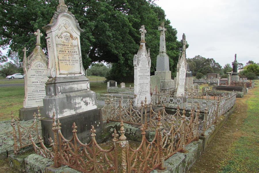 Perhaps one of the strongest hints is the way the families moved around to different regions of Victoria at similar times and eventually all ended up in the Nagambie/Murchison area. No better evidence perhaps than where they were all eventually buried. Other than Daniel who is buried at Murchison just 27km or 17 miles north, all these first Keady arrivals in Victoria are buried in a line at Nagambie Cemetery.