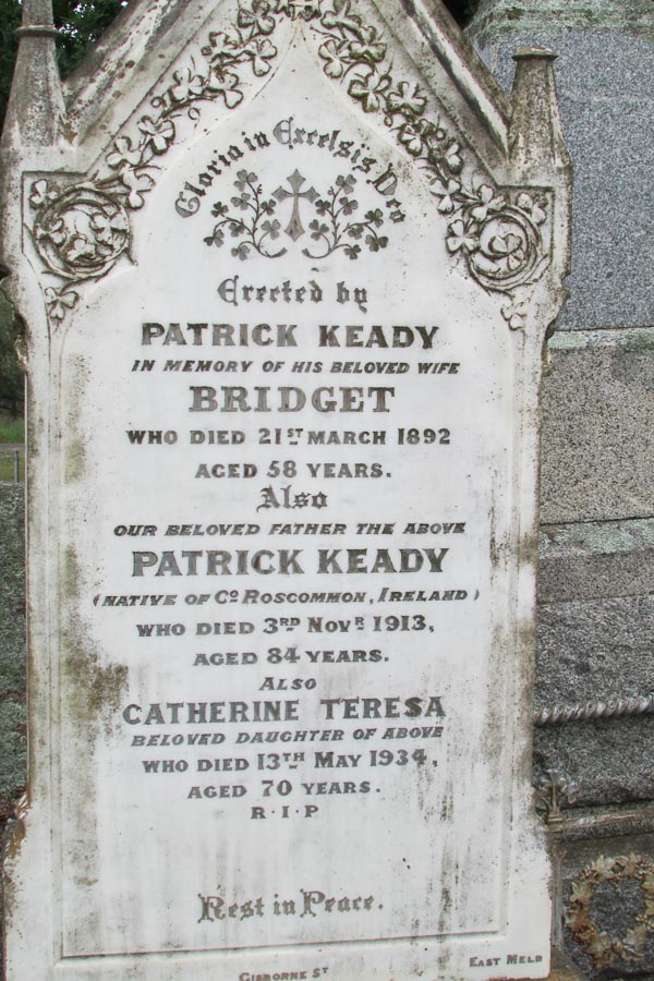 3. Patrick Nolan Keady (1830-1913), wife Bridget Keady (nee Cusack) (1834-1892), their daughters Catherine Teresa Keady (1864-1934) and Elizabeth Keady (1873-1947), neither of whom married. (Elizabeth’s name appears below the headstone.)