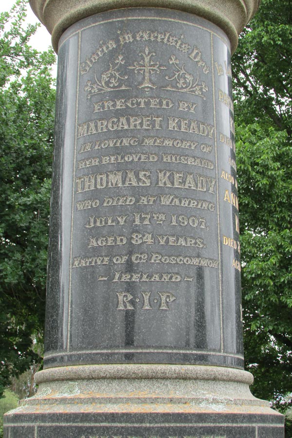 4. Thomas Keady (1829-1907), wife Margaret Keady (nee Kenny) (1836-1924), their son, Patrick James Keady (1870-1937) and his wife Annie Marie Keady (nee O’Dea) (1870 -1950). (Details of Patrick and Annie are enscribed on the side of the column.)