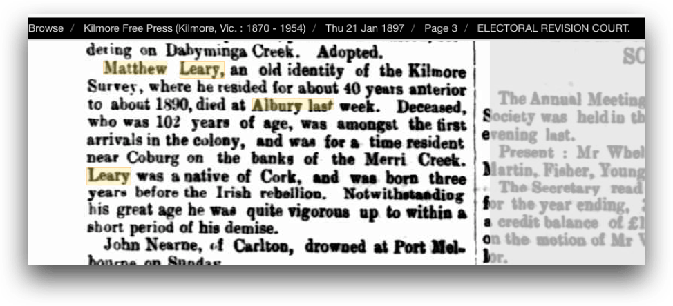 In addition, Margaret and Elizabeth’s father, Mathew “Barney” O’Leary finished his days in Albury, passing to the other side in 1897 at the ripe old age of 102.