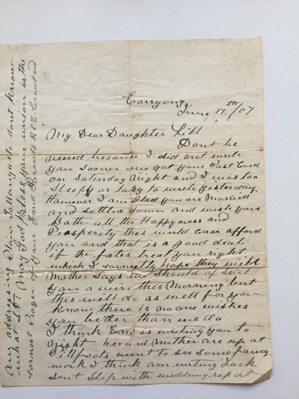 The family “story” is that Lillian’s parents were not at the Wedding and the following letter from her father seems to confirm that story. An attempt has been made below the letter to transcribe the content. Punctuation was clearly not a strong skill for the writer, Lillian’s father Robert. He hasn’t done a bad job at all, considering he had no formal schooling.