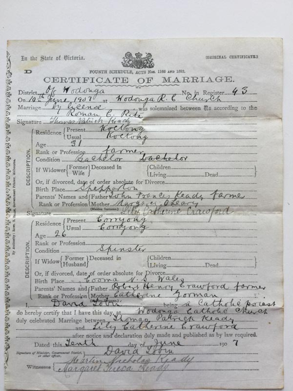 At the time of their wedding on 10th June 1907, at St Augustine’s, Lillian’s place of residence is given as Corryong, where her parents, Robert Henry and Catherine “Kitty” Crawford(nee Gorman) were living. However, Lillian was most likely boarding in Tallangatta, where she was working. Thomas Keady is noted as living at Koeting on the road between Wodonga and Corryong, however he was also living away from home, working in gold fields at Sandy Creek, just outside Tallangatta. Thomas was 33 years old and Lillian was 26 years old.