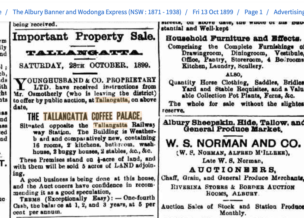 (The Railway Hotel was burnt to the ground a couple of years latter and replaced by a substantial brick built hotel, which after going through many owners and facelifts was demolished in 2020. Miss Moore sold up in 1909, and moved to take up a licence for a Hotel in Cootamundra.)