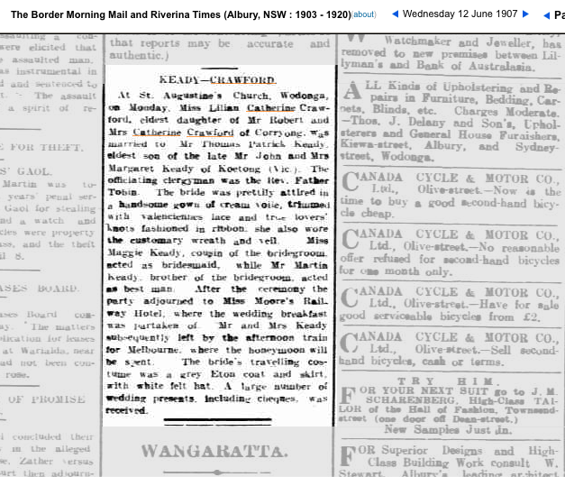 The best man was Martin Keady, Thomas’s younger brother and Maggie Keady (Margaret Teresa Keady), Thomas’s cousin acted as Bridesmaid. There is no mention of other family members in an article published by “The Border Morning Mail and Riverina Times on Wednesday, 12 June, 1907. Typically such newspaper reports of weddings would include a long list of attendees and describe the gifts each had given to the bride and groom.