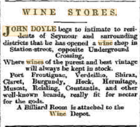 In 1888 John applies for, and presumably is granted a colonial wine licence for a store in Station Street, Seymour, directly opposite the railway station. For the next few years he regularly advertises in the local newspaper.