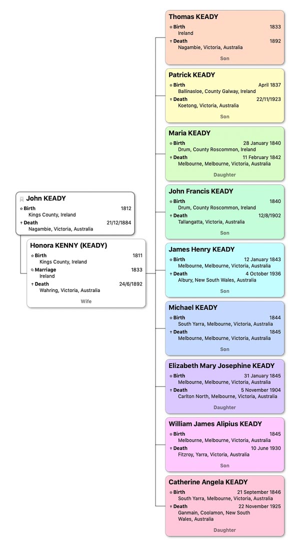 John Keady (1812-1884) and his wife Hanora (1811-1892)(nee Kenny) arrived with four children; Thomas (8 years old), Patrick (5 years old) and twins John and Mary (18 months old). The shipping record confirms that John and Mary were twins.