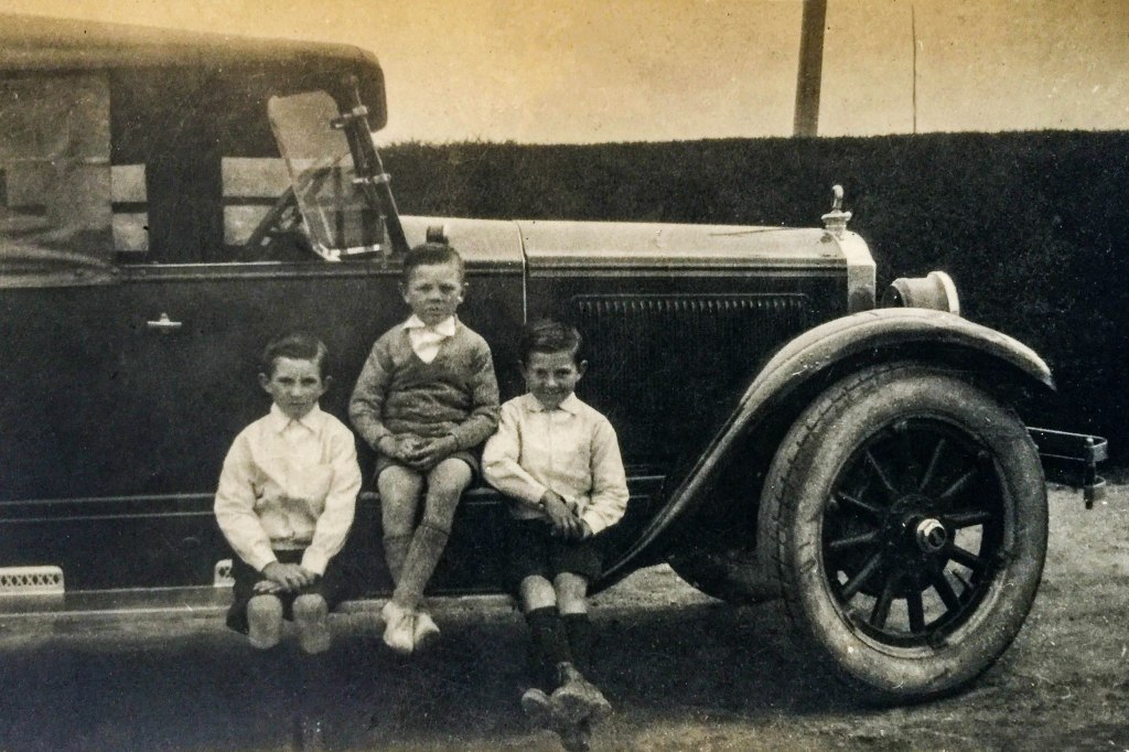 Thomas Patrick “Tommy” Keady and wife Lillian are sitting in the grass. Eldest son, John Dennis “Jack” sitting in grass by the front wheel with his younger brother Fred leaning on the bonnet.