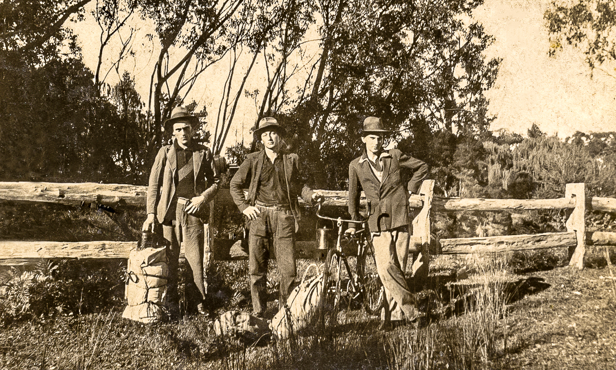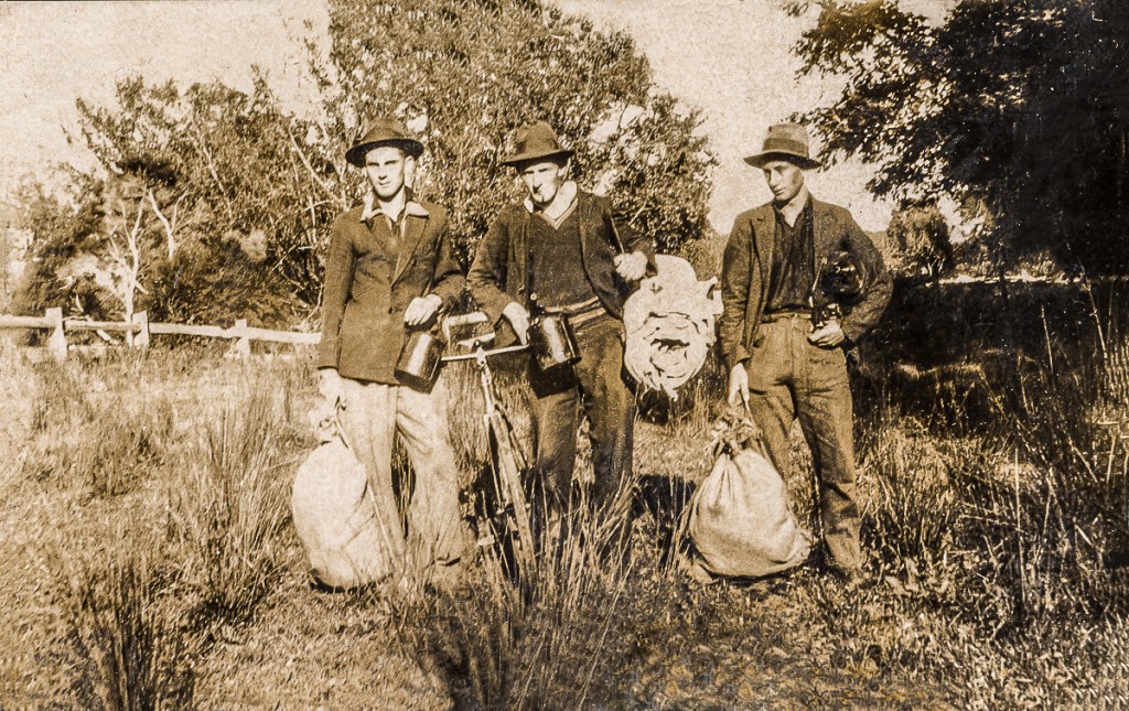 Roy Keady on left, wearing footy jumper under jacket, right hand holding billy on top of swag. Fred on right, hand on bicycle crossbar. Person in middle possibly Thomas Keady holding handlebar of bike. Joan thinks it could also be Jack..