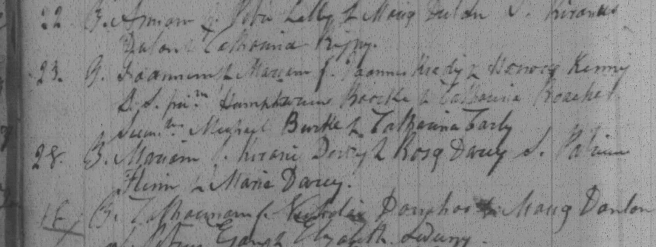 Reading across from the numeral, “23” two names can be seen, Joannus and Mariam. In other words, John and Mary, confirming that this is indeed the record of the Baptism for the twins of John Keady and Honora Kenny.