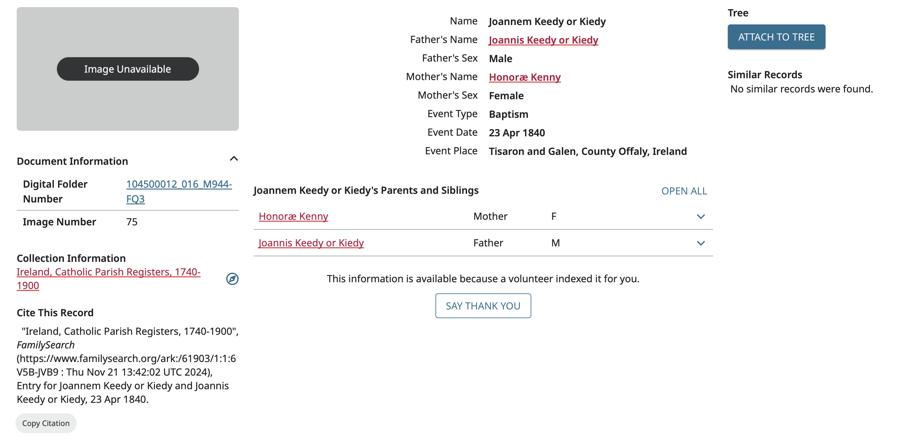 A recent search through the Family Search web service, a free web service provided by “The Church of Jesus Christ of Latter-day Saints”, hit gold. A record was found for the baptism of Joannem Keedy or Kiedy, with his parents being Joannis Keedy or Kiedy, father; and mother, Honorae Kenny. Screen shot below. (Website: family search.com)